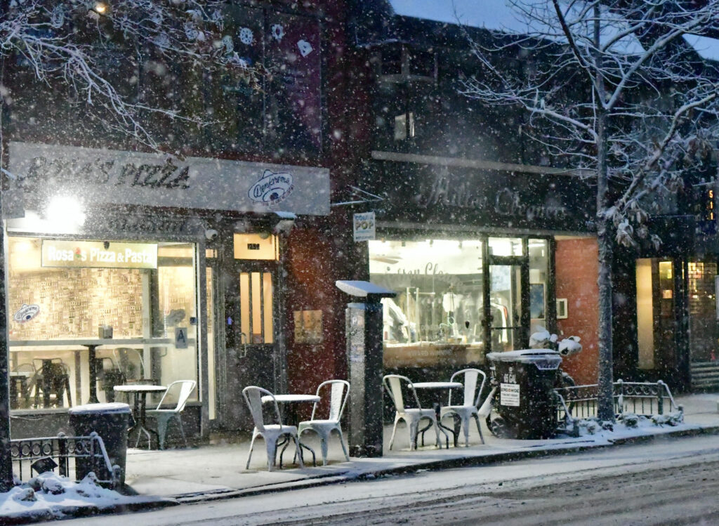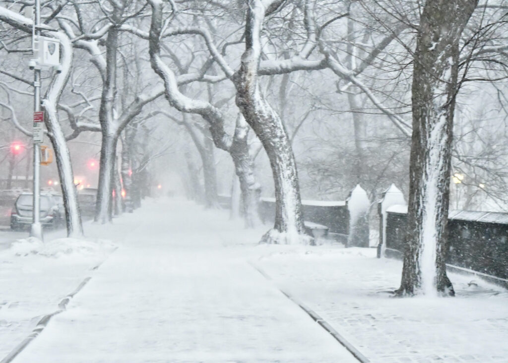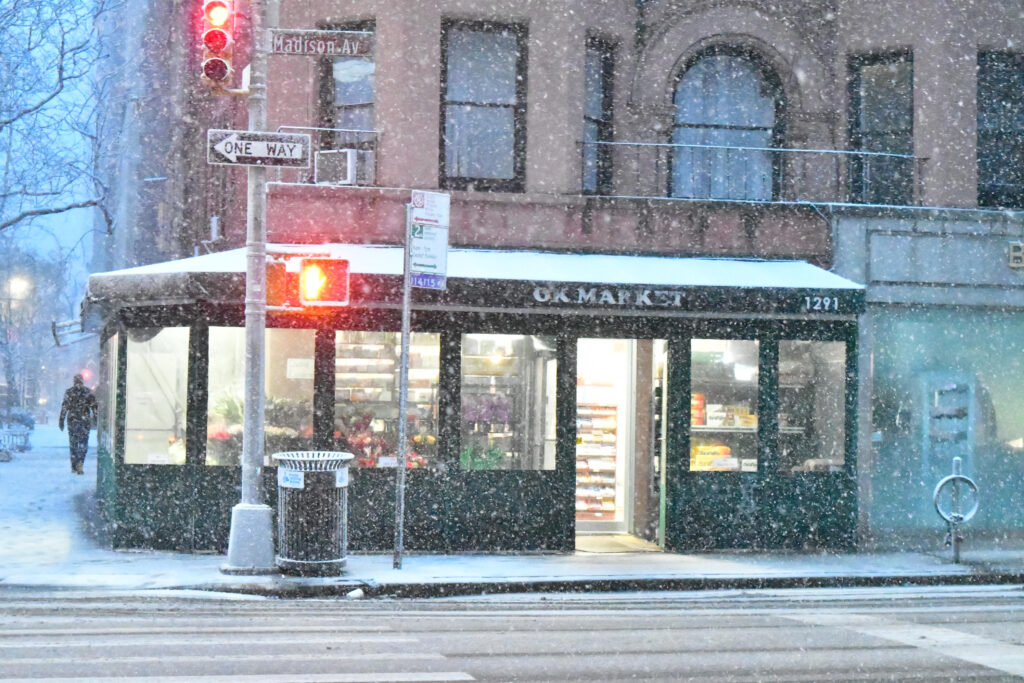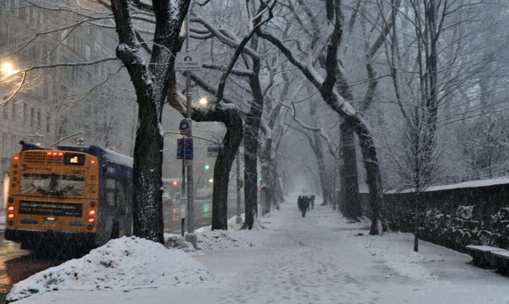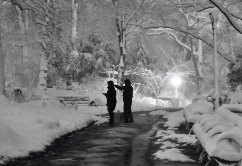 A to park koło siedziby nowojorskich burmistrzów- Gracie Mansion- koło północy. Sporo ludzi, biorąc pod uwagę warunki;) W wiadomościach podano, że odwołano „setki lotów“, nie działają też niektóre linie metra. Śniegu przybywa co godzinę, w zależności od miejsca ,od 3-7 cm.