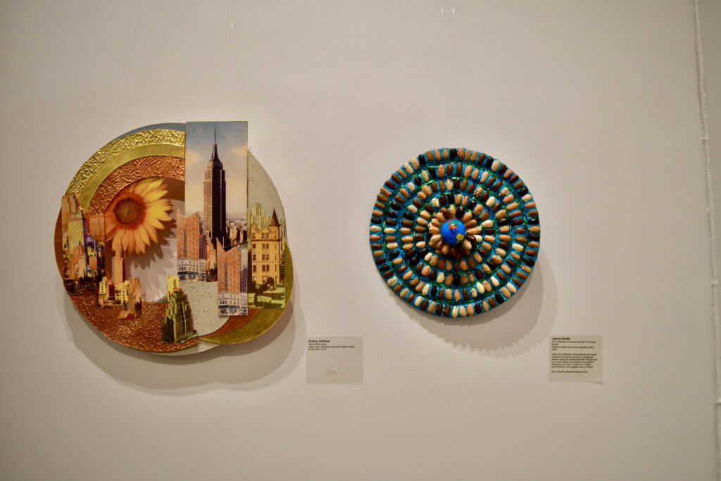 Wieniec po stronie lewej przedstawia nowojorski zachód słońca w czasie tzw. Manhattanhenge, ten po prawej jest wykonany z lakierowanych orzechów